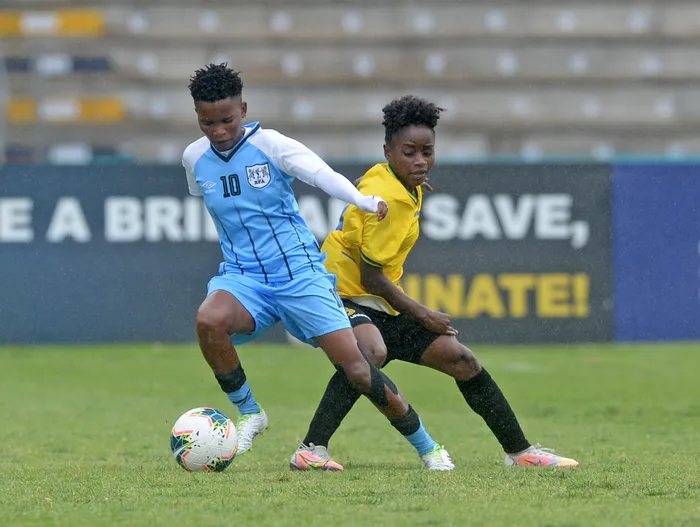 Lesego Radiakanyo of Botswana is challenged by Stumai Athuman of Tanzania during the 2021 COSAFA Womens Championship Group B game between Botswana and Tanzania at Madibaz Stadium in Gqeberha on 2 October 2021. Picture: Ryan Wilkisky/BackpagePix