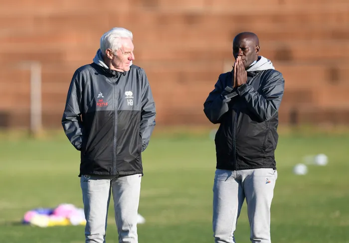 Helman Mkhalele (right) and Hugo Broos (left) during the Bafana Bafana Training at Sturrock Park on the 1 June 2022. Picture: Sydney Mahlangu/BackpagePix