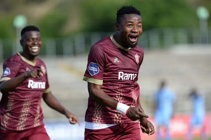 Stellenbosch FC’s Nathan Sinkala celebrates after scoring their second goal in their DStv Premiership game against Chippa United at Danie Craven Stadium in Stellenbosch on Saturday. Photo: Ryan Wilkisky/BackpagePix