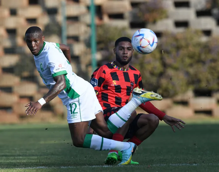 Ebrahim Seedat of TS Galaxy challenges George Maluleka of AmaZulu during their DStv Premiership match at Bidvest Stadium in Johannesburg on Sunday Ebrahim Seedat of TS Galaxy challenges George Maluleka of AmaZulu during their DStv Premiership match at Bidvest Stadium in Johannesburg on Sunday. Photo: Sydney Mahlangu/BackpagePix