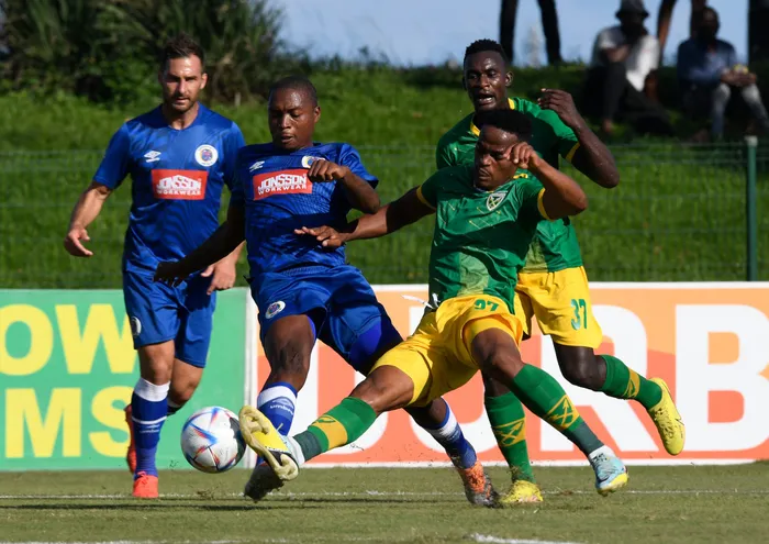 Siyavuya Ndlovu of Golden Arrows challenges Thabang Sibanyoni of Supersport United during DStv Premiership 2022/23 match at Princess Magogo Stadium Siyavuya Ndlovu of Golden Arrows challenges Thabang Sibanyoni of Supersport United during DStv Premiership 2022/23 match on 7 January 2022 at Princess Magogo Stadium. Picture: Sydney Mahlangu/BackpagePix