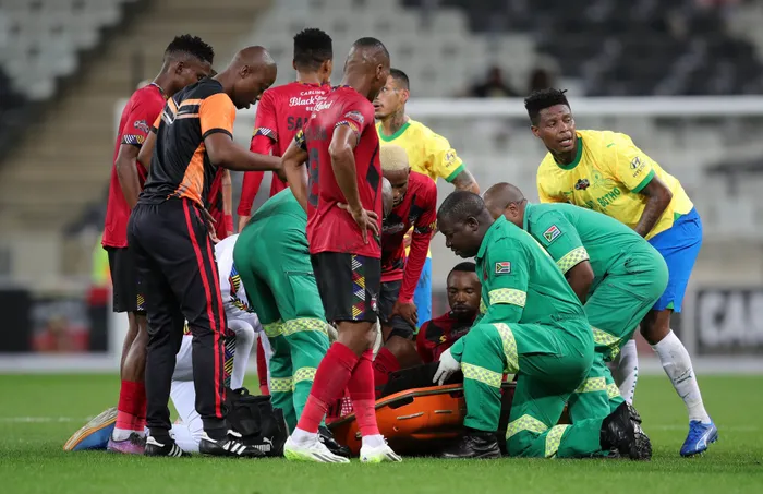 Bernard Parker of Galaxy injured during the 2023 Carling Knockout Cup last 16 match between TS Galaxy and Mamelodi Sundowns at Mbombela Stadium in Nelspruit Mamelodi Sundown’s Bongani Zungu immediately received a red card from the referee as the midfielder appeared completely unrepentant for his reckless tackle on TS Galaxy’s Bernard Parker (pictured centre on stretcher). Picture: Samuel Shivambu/BackpagePix