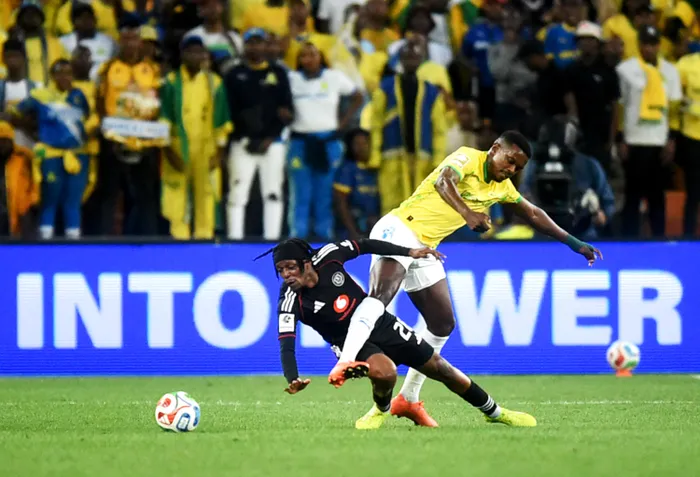 Orlando Pirates player Patrick Maswanganyi challenges for the ball against Mamelodi Sundowns' Teboho Mokoena during the Betway Premiership League against Mamelodi Sundowns at the FNB stadium, Soweto.