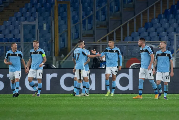 Lazio's Joaquin Correa (3-right) celebrates with team mates after scoring the 1-0 goal during the UEFA Champions League Group F soccer match between SS Lazio and Club Brugge, at Stadio Olimpico in Rome, Italy, 08 December 2020. Photo: EPA/Maurizio Brambatti