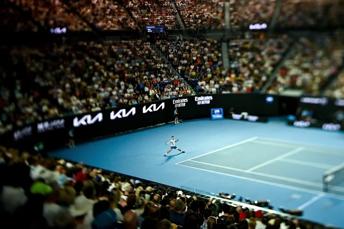 This photograph taken with a tilt-shift lens shows Serbia's Novak Djokovic hitting a return against Russia's Andrey Rublev during their men's singles quarter-final match on day ten of the Australian Open tennis tournament in Melbourne on Wednesday This photograph taken with a tilt-shift lens shows Serbia's Novak Djokovic hitting a return against Russia's Andrey Rublev during their men's singles quarter-final match on day ten of the Australian Open tennis tournament in Melbourne on Wednesday. Photo: Manan Vatsyayana/AFP