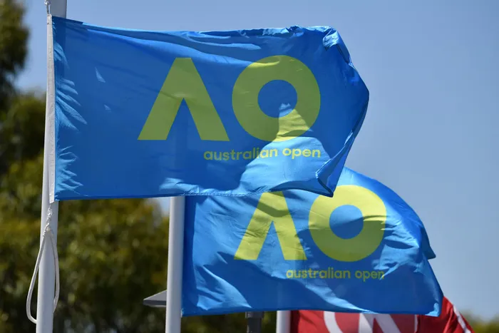 The Australian Open flags flutter in the wind. The Australian Open flags flutter in the wind during the Grand Slam tennis tournament in Melbourne. Picture: Paul Crock / AFP