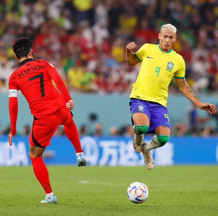 Richarlison of Brazil in action against Son Heung-min of South Korea during the FIFA World Cup 2022 round of 16 soccer match Richarlison, right, of Brazil in action against Son Heung-min of South Korea during the Fifa World Cup 2022 round of 16 soccer match at Stadium 974 in Doha, Qatar, on December 5. Picture: Rungroj Yongrit/EPA