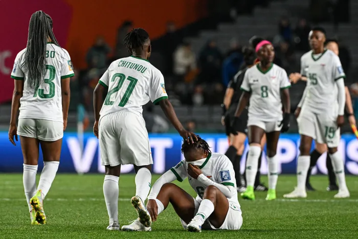 Zambia's midfielder Mary Wilombe (centre) is comforted after losing against Spain in their Women's World Cup Group C football match at Eden Park in Auckland Zambia's midfielder Mary Wilombe (centre) is comforted after losing against Spain in their Women's World Cup Group C football match at Eden Park in Auckland on July 26, 2023. Picture: Saeed Khan/AFP