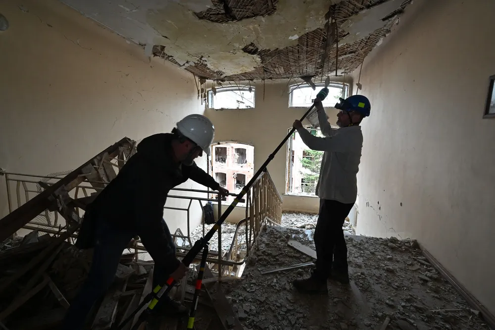 French engineer and specialist in 3D data acquisition Emmanuel Durand uses his laser-scanner in Kharkiv on May 28, 2022, to map the architecture of the damaged building of the Faculty of Economics of Karazin National University. Shells and missiles have been falling on cities since the start of the war in Ukraine, damaging historic buildings. Cultural services try to preserve their memory and record the damages with advanced laser technology and 3D scans. (Photo by Genya SAVILOV / AFP)
