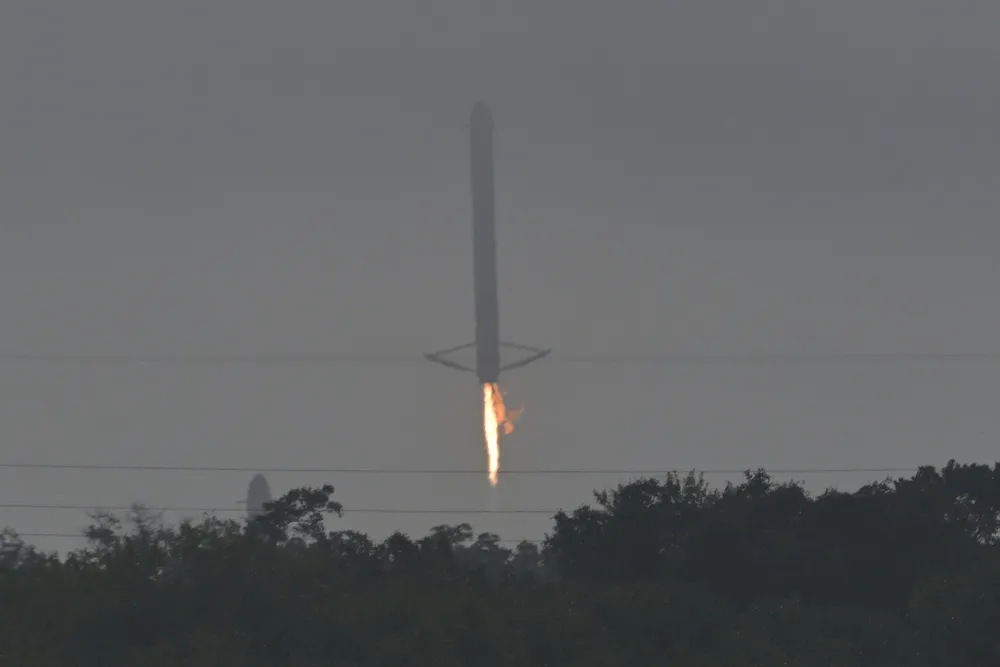 A SpaceX Falcon Heavy rocket side booster lands after launch on its mission with a classified payload for the US Space Force at Cape Canaveral, Florida on Tuesday. Picture: Joe Skipper/Reuters