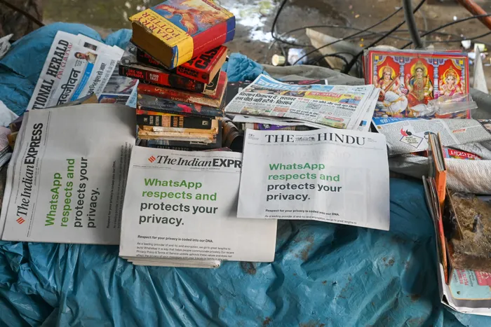 An advertisement from WhatsApp is seen in a newspaper at a stall in New Delhi. Photo by Sajjad Hussain/AFP