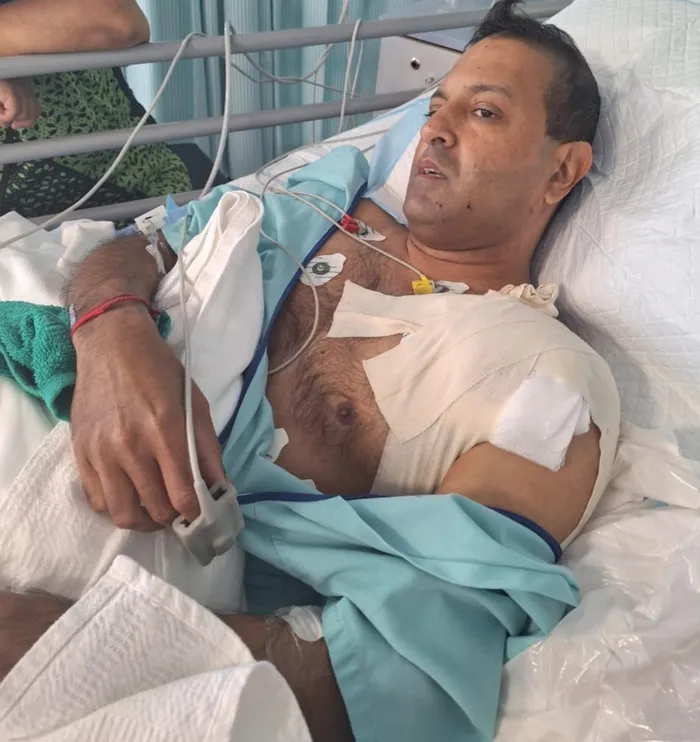 “The suspects were relentless. They continued to shoot at the driver, who was trying his best to get away. A man then emerged from the window of the vehicle. He had a huge, long gun and he fired at us and then suddenly stopped.” Ashin Nundlall is recovering in hospital. Picture: Supplied
