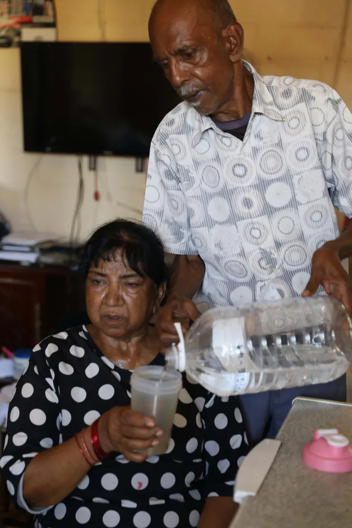 Families cannot afford bottled water for drinking and rely on water donations Radha Kandhialall and her husband are now forced to survive on less than 60 litres for several days.