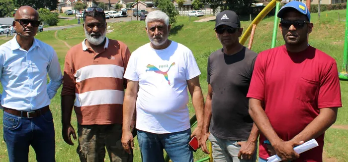 The residents fear the consequences a housing development would have for the community, who were already battling frequent water and electricity outages and failing infrastructure Shallcross residents, Marcus Richards, Kader Goolam, Suresh Babenia, Cassim Adam, and Kaylan Chetty, stand in the park that has reportedly been earmarked for a housing development for the 2022 flood victims. Picture: Nadia Khan