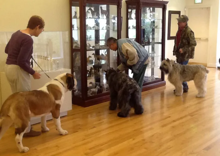 This photo provided by the American Kennel Club Museum of the Dog in Queeny Park in St. Louis shows visitors looking at museum exhibits accompanied by their dogs. This photo provided by the American Kennel Club Museum of the Dog in Queeny Park in St. Louis shows visitors looking at museum exhibits accompanied by their dogs.
