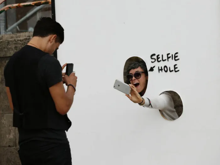 A visitor photographs herself through a 'selfie hole' at Banksy's biggest show to date, entitled 'Dismaland'. A visitor photographs herself through a 'selfie hole' at Banksy's biggest show to date, entitled 'Dismaland'.