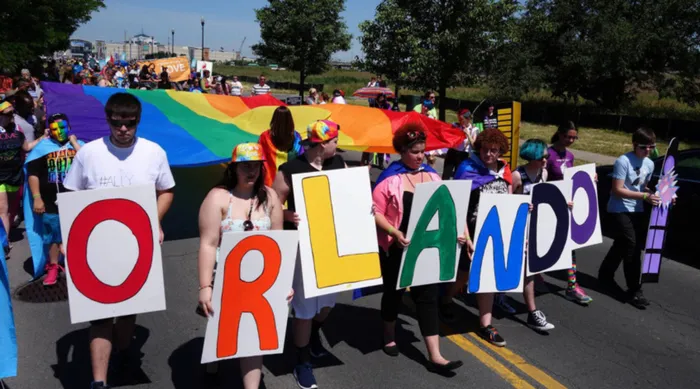 A youth group from ACR Health carry letters to commemorate the mass shooting in Orlando. A youth group from ACR Health carry letters to commemorate the mass shooting in Orlando.