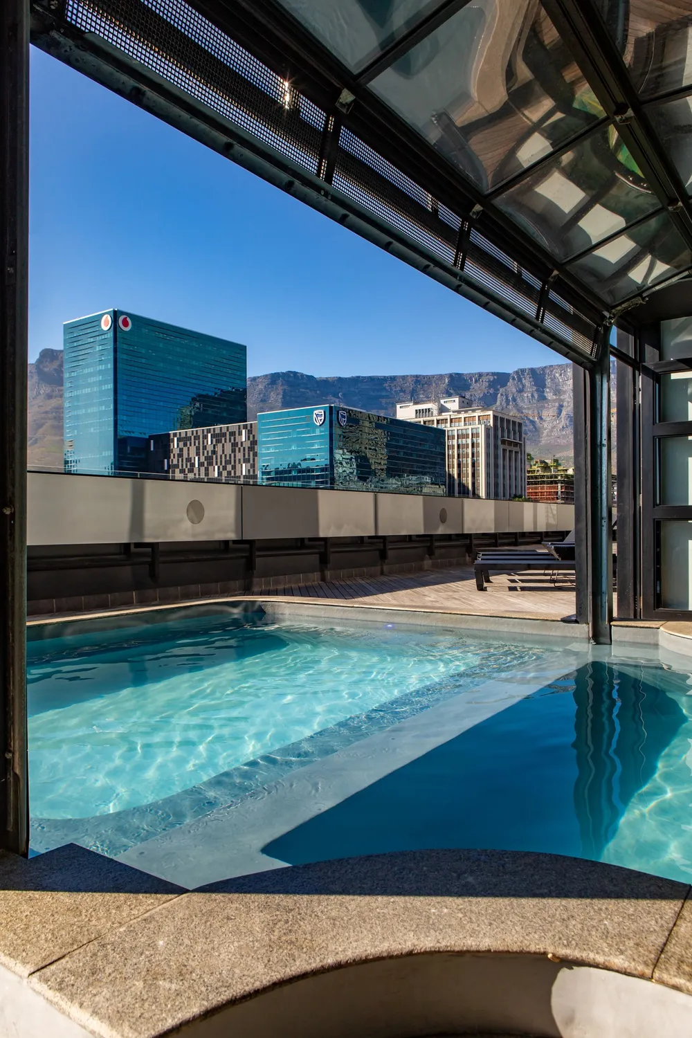 Chic poolside furniture and a beautiful mural await guests visiting this inside-outside pool on the 4th floor of this sophisticated inner-city aparthotel. The outside area is linked to the bar, making it perfect for sundowners. The area is serene with some of the most breathtaking views of the Central City and Table Mountain. There is also a spa on the same floor.