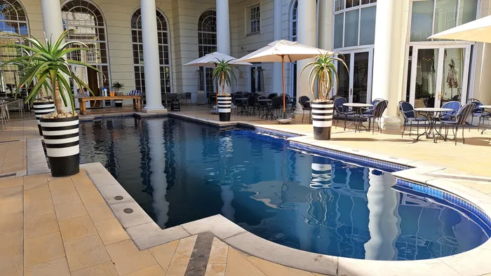Visitors to the Southern Sun The Cullinan get to cool off from Cape Town’s summer heat in a deep-blue, expansive outdoor heated pool that is surrounded by reclining chairs clad in crisp black-and-white.