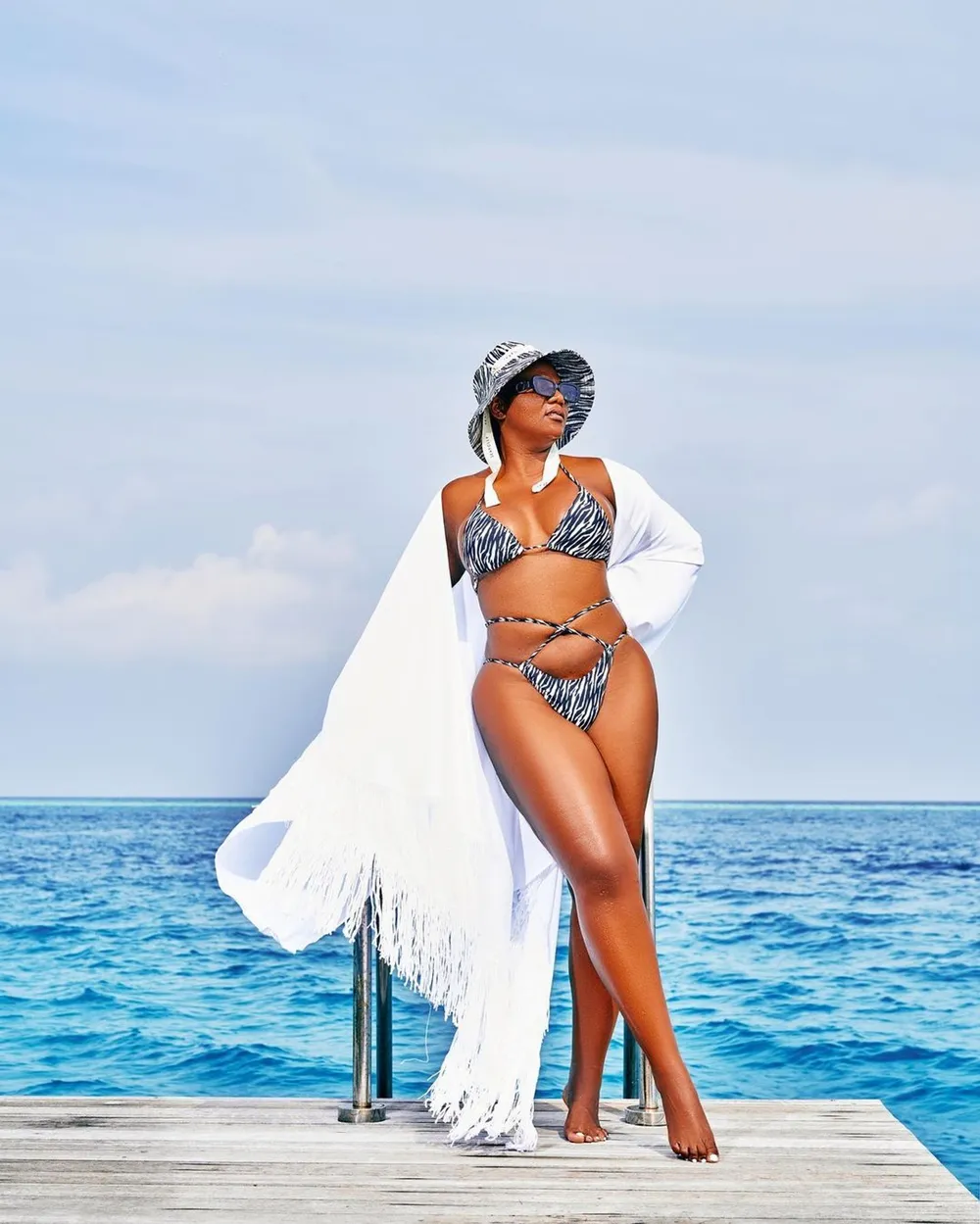 In one of the pictures captioned, “Hellooooooo… Maldives”, MaMkhize is wearing a matching zebra print bikini set with a white regal cover-up.